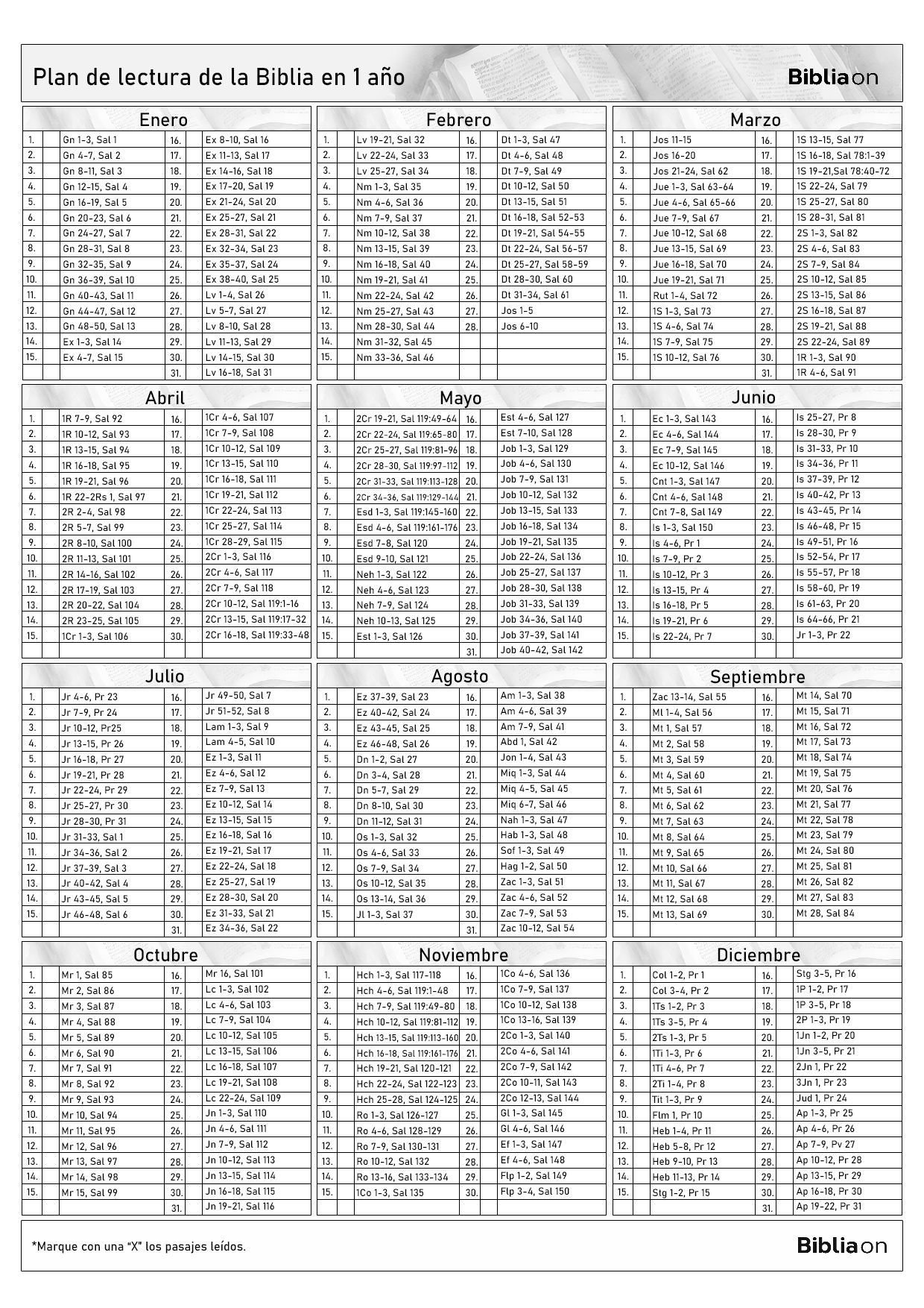 Este plan de lectura te ayuda a recorrer toda la Biblia en un año de manera sencilla y organizada. Cada día se propone leer alrededor de cuatro capítulos: tres siguiendo el orden de los libros y uno adicional seleccionado de Salmos o Proverbios. Así, al final del año habrás completado toda la Biblia y releído Salmos y Proverbios dos veces.