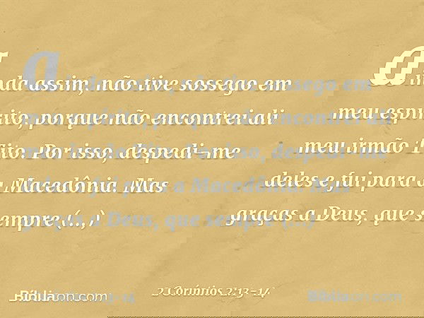 13 não tive descanso no meu espírito, porque não achei ali meu irmão Tito; mas, despedindo-me deles, parti para a Macedônia.