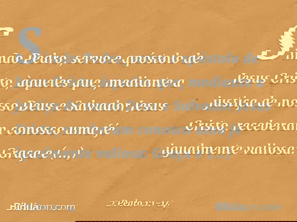 1 Simão Pedro, servo e apóstolo de Jesus Cristo, aos que conosco alcançaram fé igualmente preciosa pela justiça do nosso Deus e Salvador Jesus Cristo: