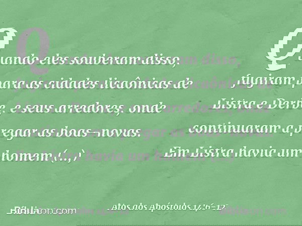 6 eles, sabendo-o, fugiram para Listra e Derbe, cidades da Licaônia, e a região circunvizinha;