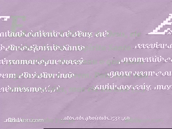 33 De sorte que, exaltado pela destra de Deus e tendo recebido do Pai a promessa do Espírito Santo, derramou isto que vós agora vedes e ouvis.