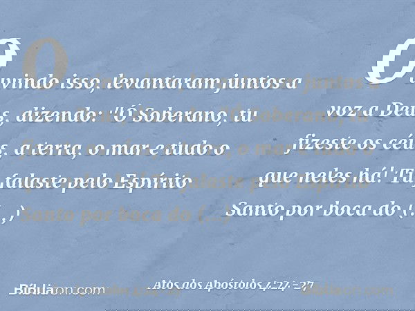 24 Ouvindo isso, levantaram juntos a voz a Deus, dizendo: "Ó Soberano, tu fizeste os céus, a terra, o mar e tudo o que neles há!