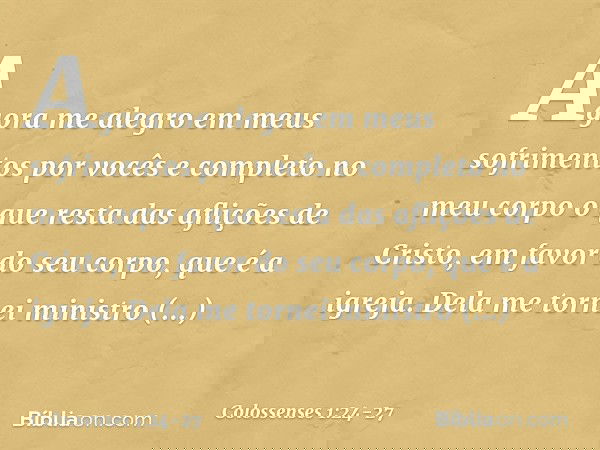 24 Agora me alegro em meus sofrimentos por vocês e completo no meu corpo o que resta das aflições de Cristo, em favor do seu corpo, que é a igreja.