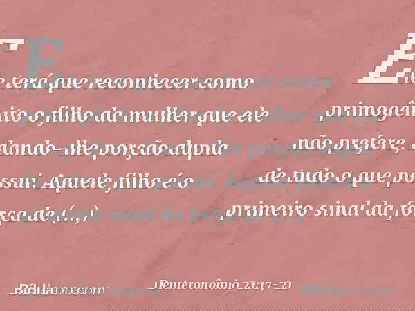 17 Ele terá que reconhecer como primogênito o filho da mulher que ele não prefere, dando-lhe porção dupla de tudo o que possui. Aquele filho é o primeiro sinal da força de seu pai e o direito do filho mais velho lhe pertence.