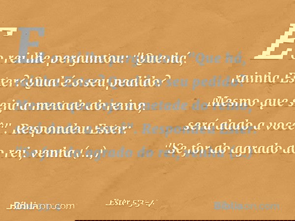 3 E o rei lhe perguntou: "Que há, rainha Ester? Qual é o seu pedido? Mesmo que seja a metade do reino, será dado a você".