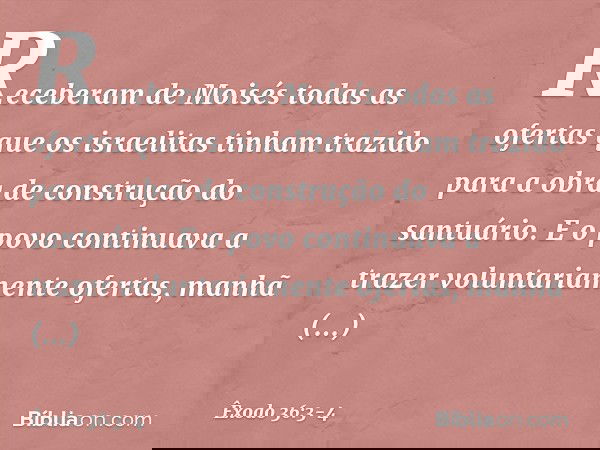 3 Tomaram, pois, de diante de Moisés toda oferta alçada que trouxeram os filhos de Israel para a obra do serviço do santuário, para fazê-la; e, ainda, eles lhe traziam cada manhã oferta voluntária.
