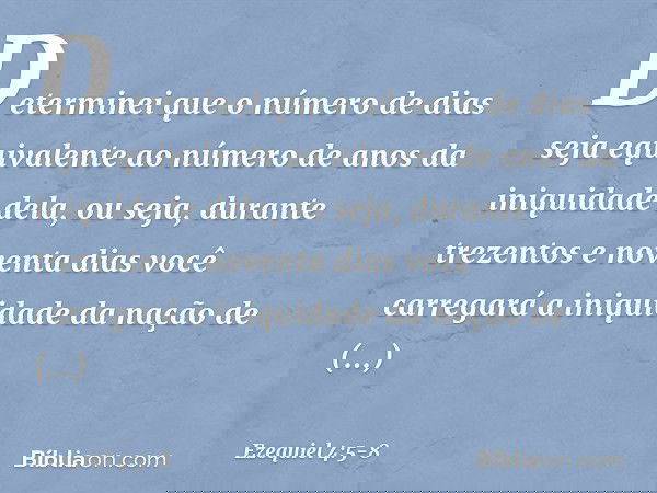 5 Determinei que o número de dias seja equivalente ao número de anos da iniquidade dela, ou seja, durante trezentos e noventa dias você carregará a iniquidade da nação de Israel.