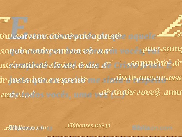 6 Estou convencido de que aquele que começou boa obra em vocês, vai completá-la até o dia de Cristo Jesus.
