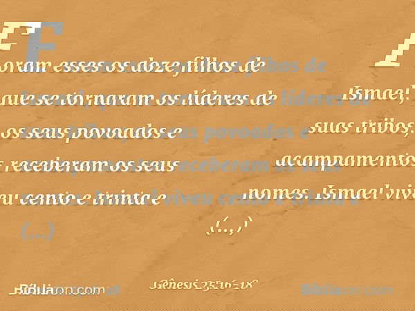 16 Estes são os filhos de Ismael, e estes são os seus nomes pelas suas vilas e pelos seus acampamentos: doze príncipes segundo as suas tribos.