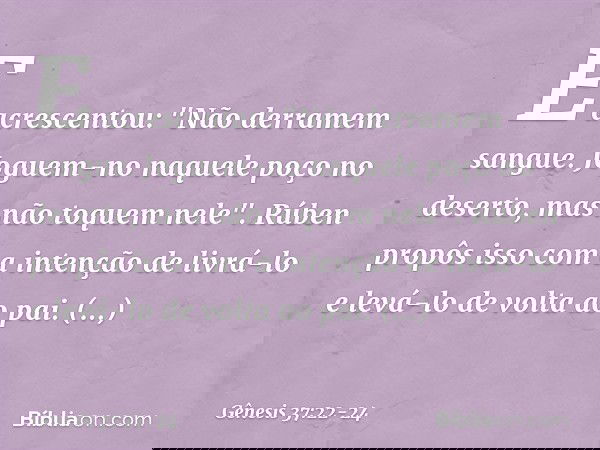 22 E acrescentou: "Não derramem sangue. Joguem-no naquele poço no deserto, mas não toquem nele". Rúben propôs isso com a intenção de livrá-lo e levá-lo de volta ao pai.