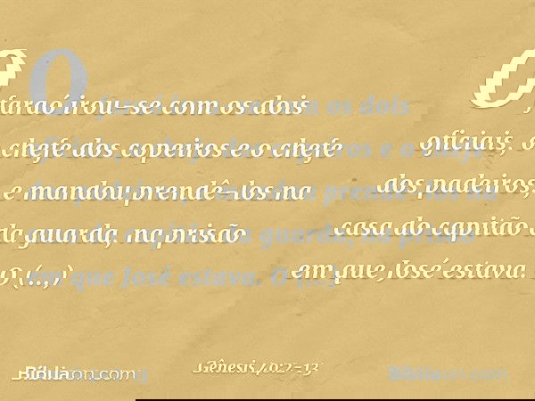 2 O faraó irou-se com os dois oficiais, o chefe dos copeiros e o chefe dos padeiros,
