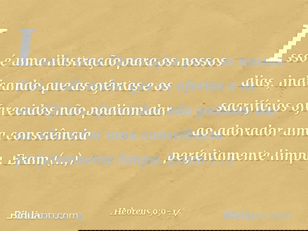 9 Isso é uma ilustração para os nossos dias, indicando que as ofertas e os sacrifícios oferecidos não podiam dar ao adorador uma consciência perfeitamente limpa.