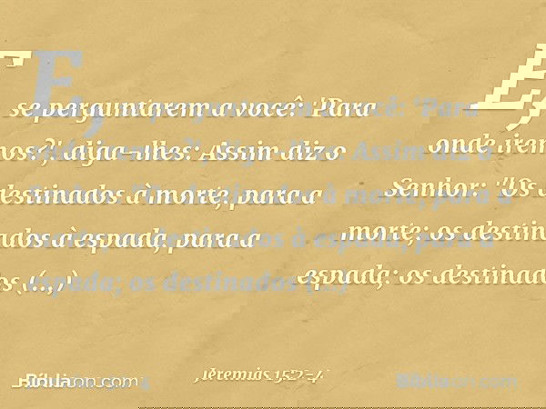 2 E, se perguntarem a você: 'Para onde iremos?', diga-lhes: Assim diz o Senhor: