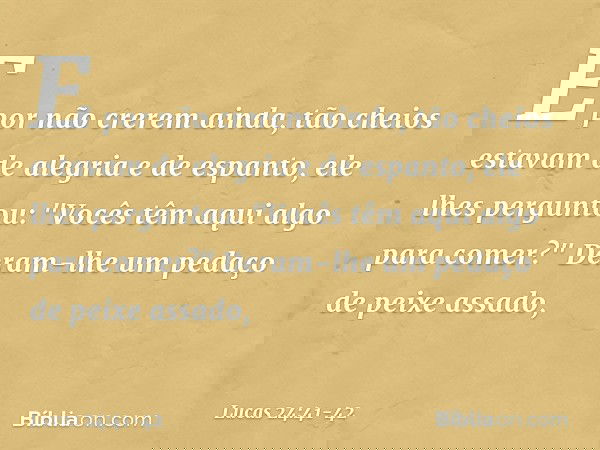41 E por não crerem ainda, tão cheios estavam de alegria e de espanto, ele lhes perguntou: "Vocês têm aqui algo para comer?"
