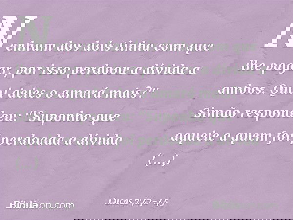42 E, não tendo eles com que pagar, perdoou-lhes a ambos. Dize, pois: qual deles o amará mais?