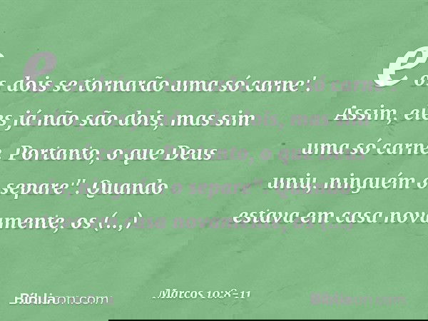 8 e os dois se tornarão uma só carne'. Assim, eles já não são dois, mas sim uma só carne.