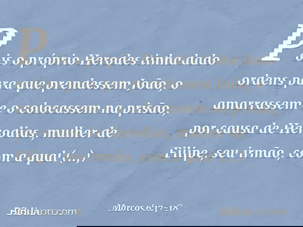 17 Pois o próprio Herodes tinha dado ordens para que prendessem João, o amarrassem e o colocassem na prisão, por causa de Herodias, mulher de Filipe, seu irmão, com a qual se casara.