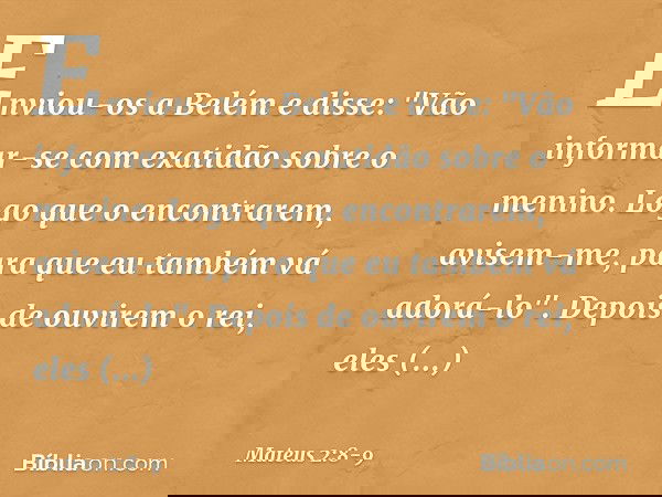 8 Enviou-os a Belém e disse: "Vão informar-se com exatidão sobre o menino. Logo que o encontrarem, avisem-me, para que eu também vá adorá-lo".