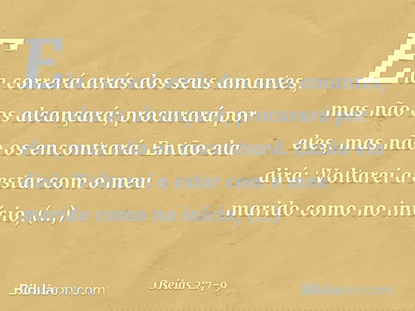 7 E irá em seguimento de seus amantes, mas não os alcançará; e buscá-los-á, mas não os achará; então, dirá: Ir-me-ei e tornar-me-ei a meu primeiro marido, porque melhor me ia, então, do que agora.