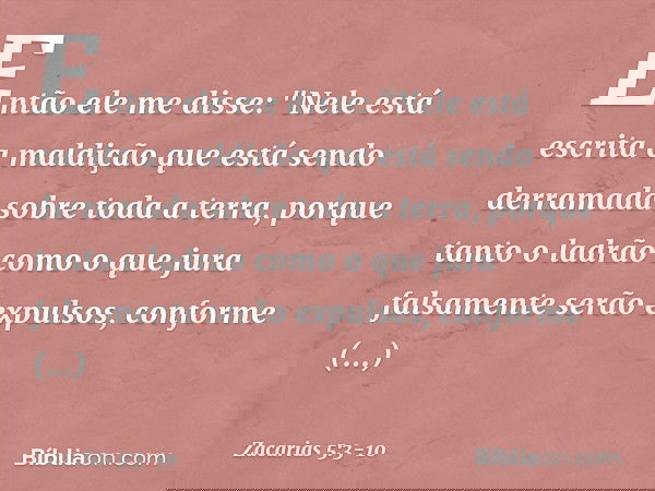 3 Então ele me disse: "Nele está escrita a maldição que está sendo derramada sobre toda a terra, porque tanto o ladrão como o que jura falsamente serão expulsos, conforme essa maldição.